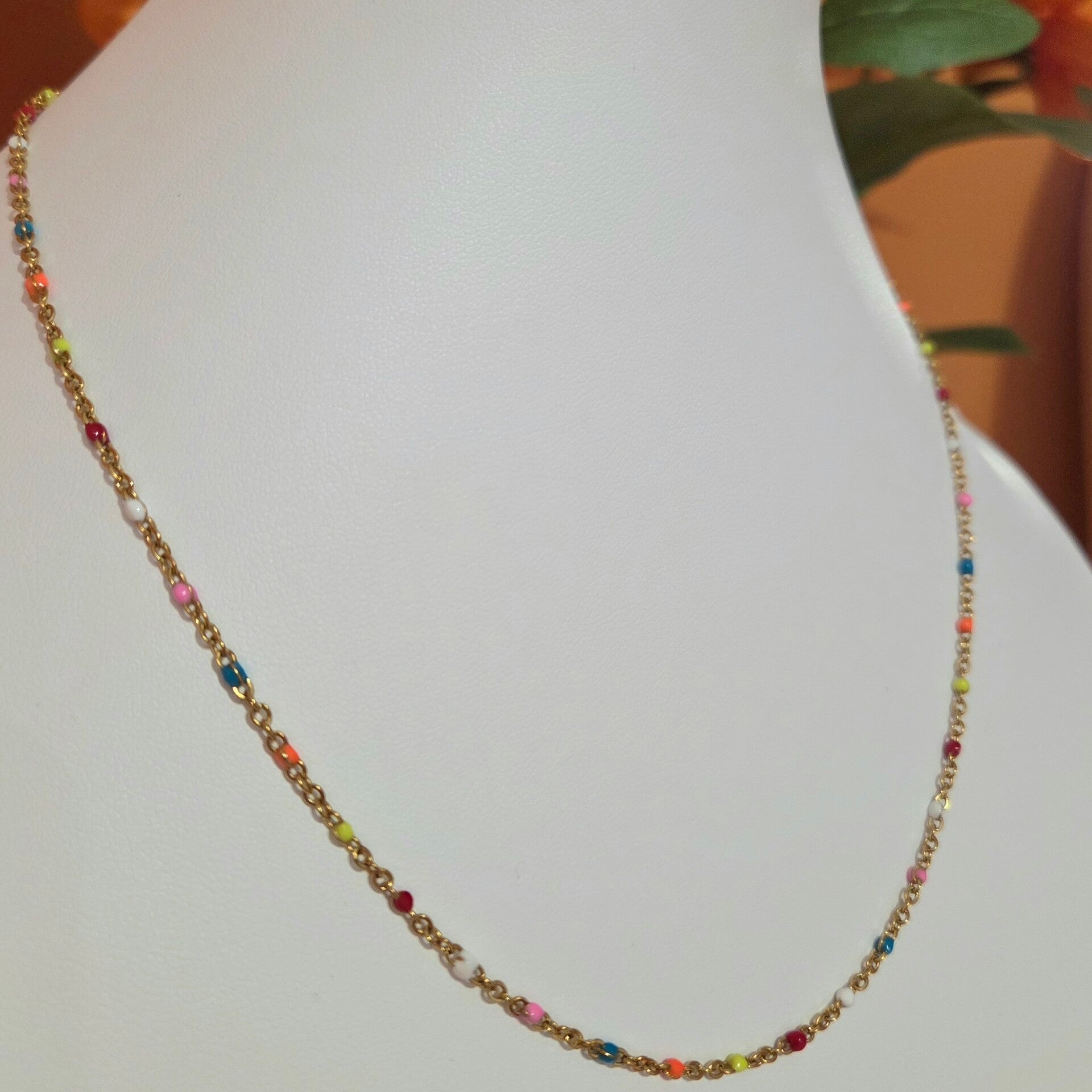 Deze stijlvolle ketting is sterk en subtiel, heeft om het x aantal schakels een gekleurd emaille bolletje. Hierdoor past hij bij iedere fleurige look en combineer je hem perfect bij onze oorbellen! Ook perfect om te dragen in de zomer, met een basic outfit en een slippertje voor de 'perfecte ibiza ook'